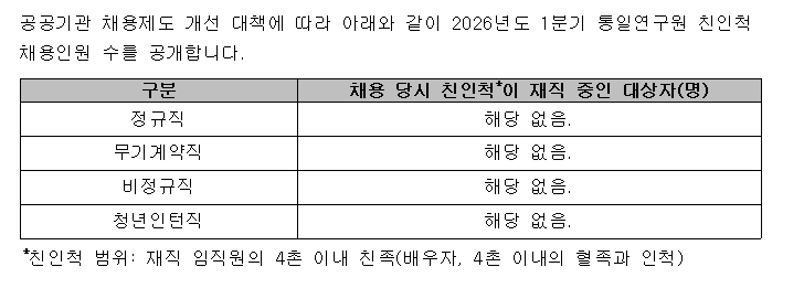 2026년도 1분기 통일연구원 친인척 채용인원 수