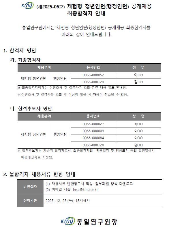 [채용] 2025년도 체험형 청년인턴(행정인턴) 공개채용 최종결과 발표(제2025-06호, 8월 21일 공고)