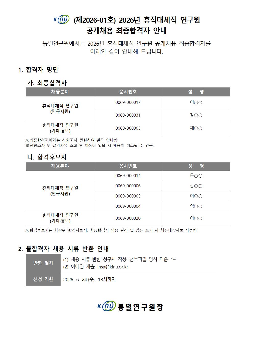 [채용] 2026년 휴직대체직 연구원 공개채용 최종 결과 발표(제2026-01호, 2월 12일자 공고)