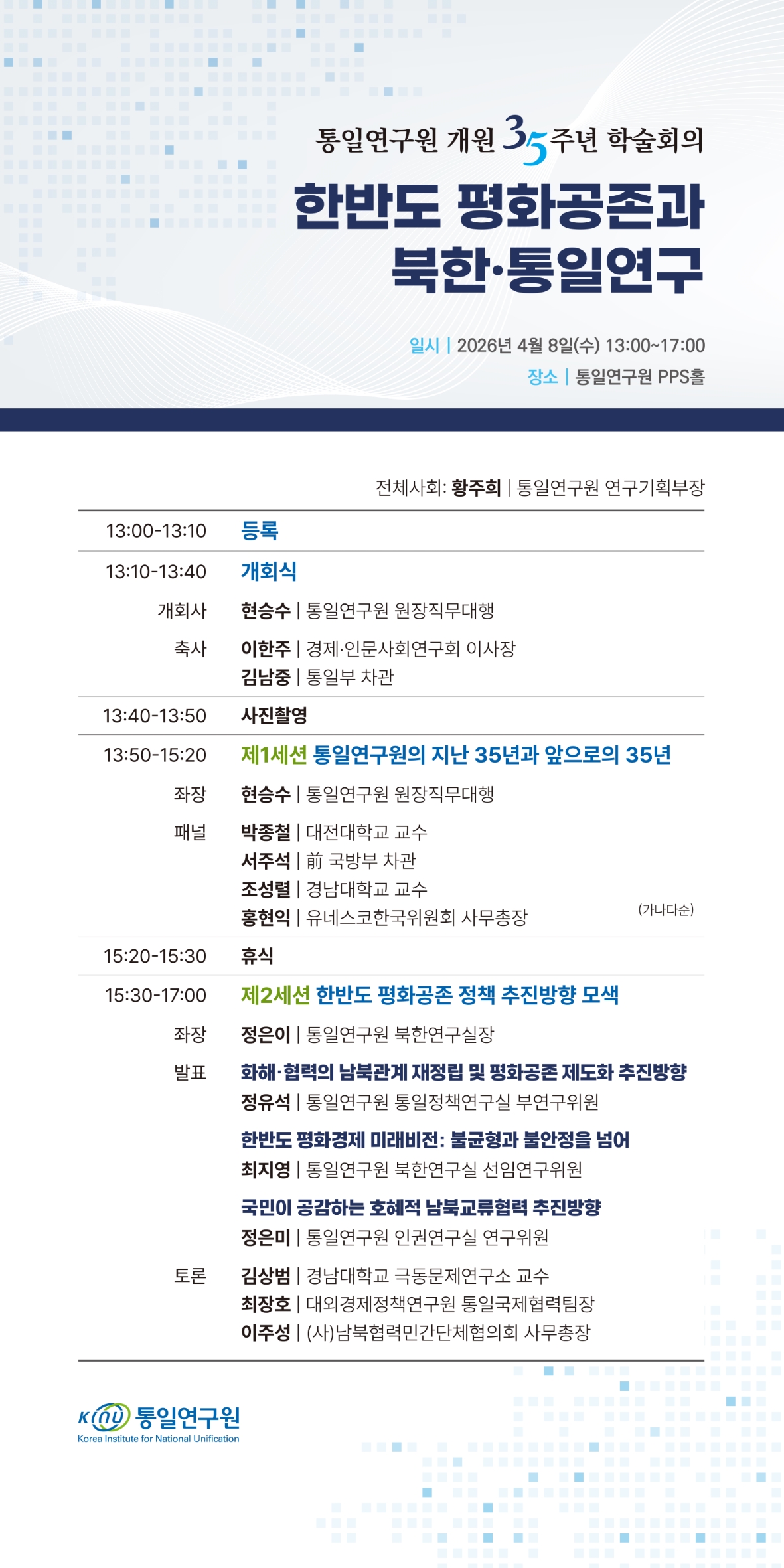 202604.08 국내회의 / 학술회의 개원35주년 학술회의 「한반도 평화공존과 북한·통일연구」 일시 2026-04-08 13:00 ~ 15:00 장소 조달청 PPS홀 주제 한반도 평화공존과 북한·통일연구 주최 통일연구원 조회수 276 초청장 1차수정[III배너] 통일연구원 개원 35주년 학술회의.jpg 자료집 첨부된 파일이 없습니다.